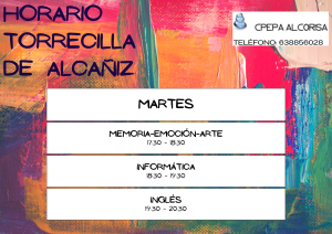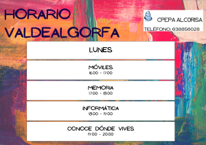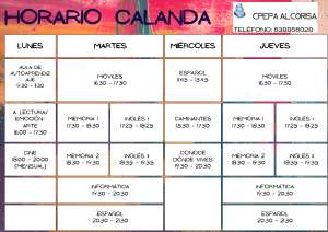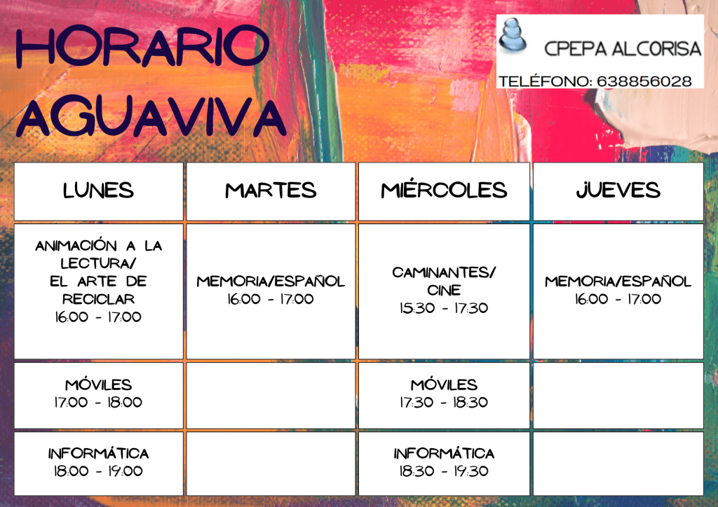 A continuación se muestran los horarios para este curso de las 14 aulas del CPEPA Alcorisa. También puedes consultarlos en el grupo de difusión del centro, en las puertas de los distintos edificios de las aulas o bien llamando o escribiendo al 978441117 – 638 856028